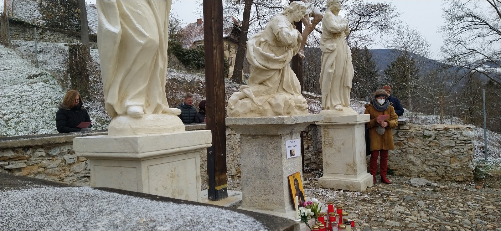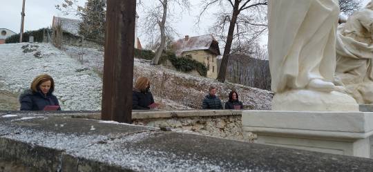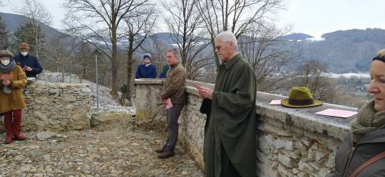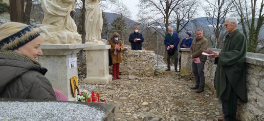 Am 5. Fastensonntag, dem 21. März 2021, gestaltete Dr. Alfred Stampler gemeinsam mit seiner Gattin Ulrike, Mag. Anton Gschier, Gläubigen und Vertreter/innen des Pfarrkirchenrates und des Vereins „Kirchberg Deutschfeistritz – Verein zur Erhaltung und Revitalisierung des Kalvarienberges“ im Bereich der Kreuzigungsgruppe, der 5. Station, die dem Motto „Tatort Kreuz – Täter und Opfer“ gewidmet ist, eine Andacht.