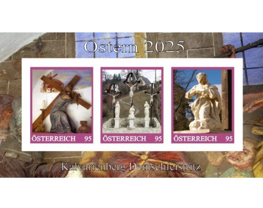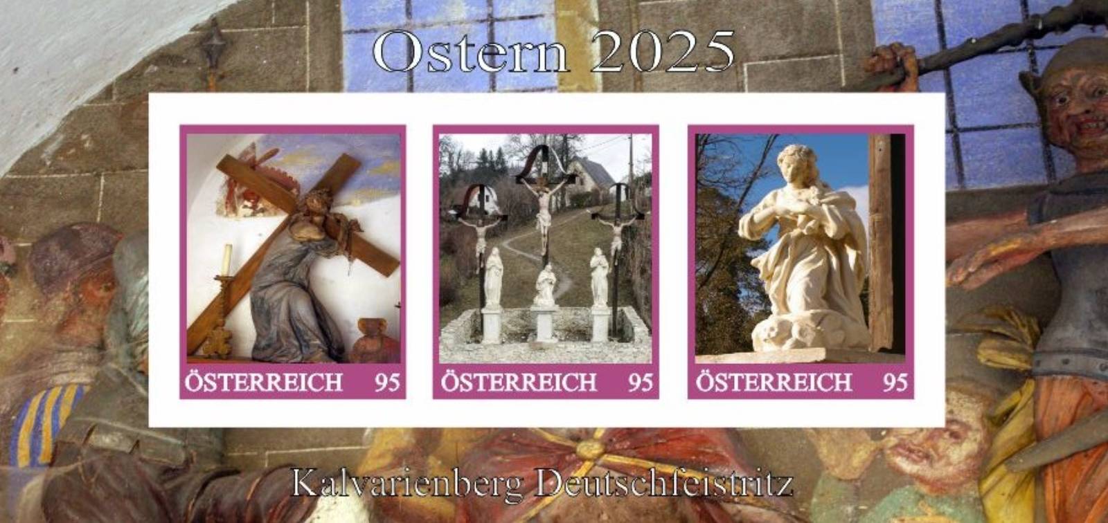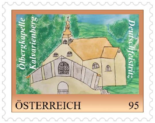 Neben einem Briefmarkenblock mit Bildern der Kreuzigungsgruppe wird eine Briefmarke mit der Ölbergkapelle, die von Leonie Heß, einer Schülerin der MS Deutschfeistritz gestaltet worden ist, präsentiert.
